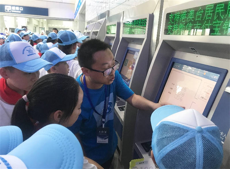 在雅安火車站行政辦公樓旁的操場上,運(yùn)通公司工作人員就雅安火車站相關(guān)情況向孩子們進(jìn)行了簡單介紹,對孩子們提出的問題進(jìn)行了一一解答。下午4點(diǎn)13分,伴隨響亮的鳴笛聲,一輛動車駛出站臺,孩子們歡呼雀躍,興奮不已。在雅安火車站售票大廳,運(yùn)通公司員工向孩子們講解了自助購、取票操作流程。