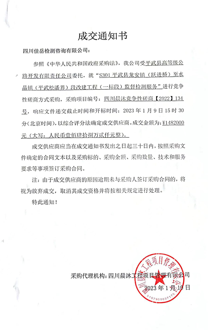 新年新業(yè)績 兔年新氣象 四川佳岳檢測咨詢有限公司中標(biāo)首個(gè)市外檢測項(xiàng)目