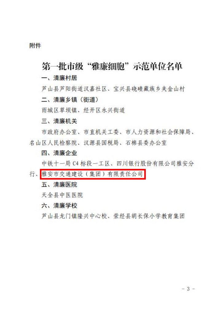 經(jīng)過雅安市黨風(fēng)廉政建設(shè)責(zé)任制領(lǐng)導(dǎo)小組辦公室嚴格考評審定,雅安市交通建設(shè)(集團)有限責(zé)任公司被命名為第一批市級“雅廉細胞”示范單位(清廉企業(yè))。