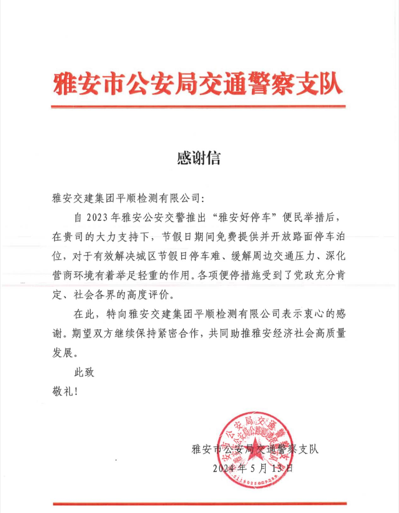 近日,雅安交建集團(tuán)平順公司收到一封來(lái)自雅安市公安局交通警察支隊(duì)的感謝信,對(duì)平順公司積極響應(yīng)雅安公安交警“雅安好停車”便民措施,在節(jié)假日期間免費(fèi)提供并開(kāi)放路面停車泊位表示感謝。