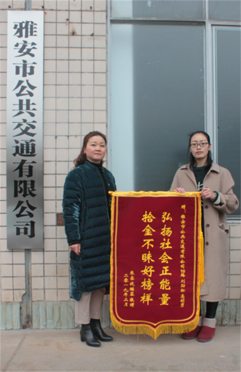 “請一定把我們的感謝帶給駕駛員和發(fā)班員。”2月14日下午17時15分左右,一名手拿寫著“拾金不昧好榜樣弘揚社會正能量”錦旗的市民錢續(xù)露來到雅安市公共交通有限公司,將錦旗送到了經(jīng)理助理方媛手上,請她把感謝之意轉(zhuǎn)達給10路公交車駕駛員劉進松和發(fā)班員高胡秀。