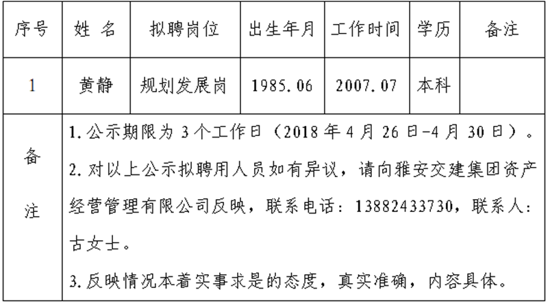 雅安交建集團資產(chǎn)經(jīng)營管理有限公司擬聘用人員公示