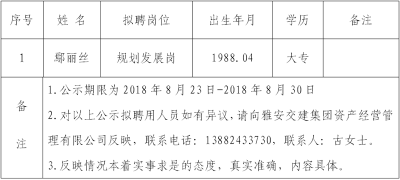 雅安交建集團(tuán)資產(chǎn)經(jīng)營管理有限公司擬聘用人員公示(8月二期)