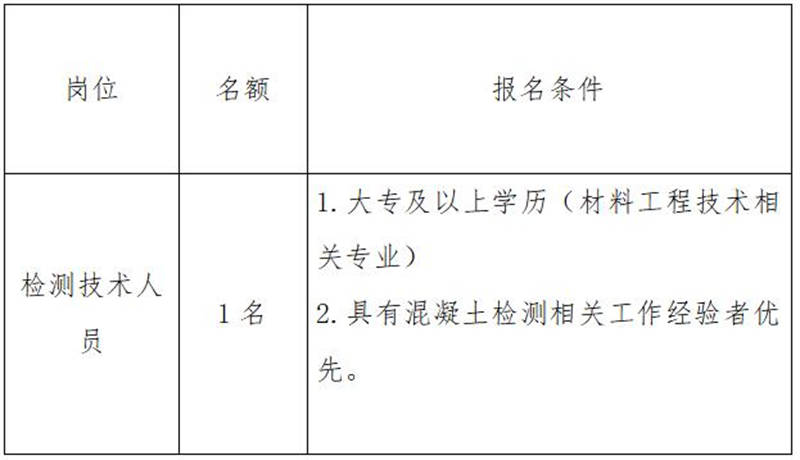 雅安交建集團(tuán)康居建設(shè)工程質(zhì)量與室內(nèi)環(huán)境污染檢測(cè)有限公司是雅安市交通建設(shè)(集團(tuán))有限責(zé)任公司下屬子公司,主要從事民用建筑室內(nèi)環(huán)境污染檢測(cè)業(yè)務(wù)。現(xiàn)根據(jù)公司業(yè)務(wù)發(fā)展需要,擬向社會(huì)公開招聘1名技術(shù)檢測(cè)人員,現(xiàn)將有關(guān)事項(xiàng)公告如下: