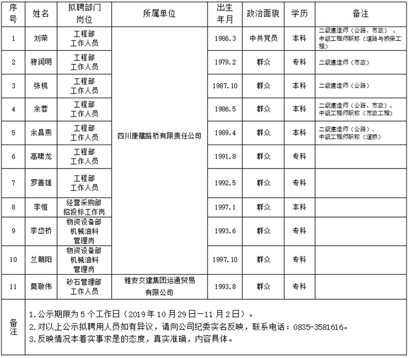 雅安交建集團關于公開招聘所屬子公司班子成員的公告(路橋公司)