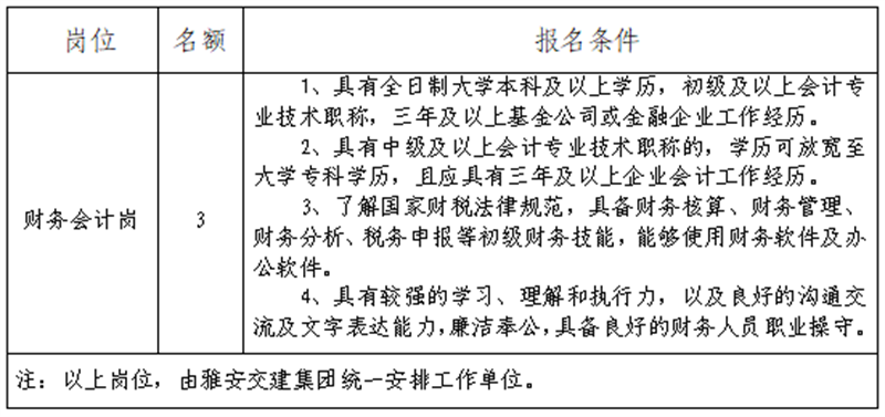 根據(jù)發(fā)展需要,決定面向社會公開招聘雅安市交通建設(shè)(集團(tuán))有限責(zé)任公司(以下簡稱“雅安交建集團(tuán)”)所屬子公司財(cái)務(wù)工作人員3名,現(xiàn)將有關(guān)事項(xiàng)公告如下: