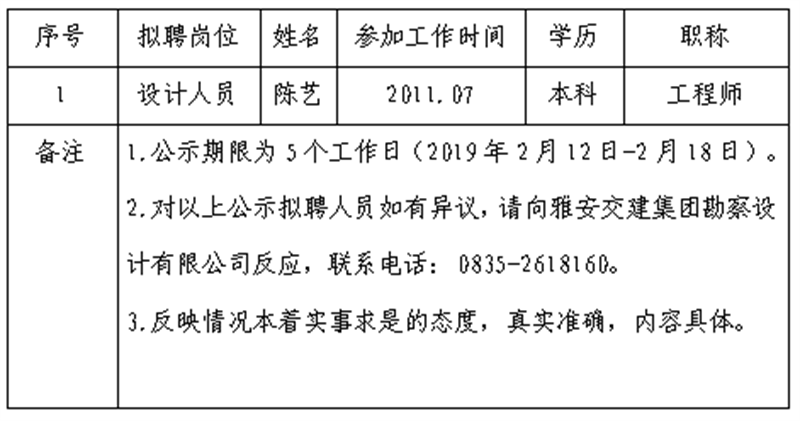 通過公開報名、資格審查、面試等程序,經(jīng)雅安交建集團勘察設計有限公司研究,對以下1名擬聘用人員予以公示: