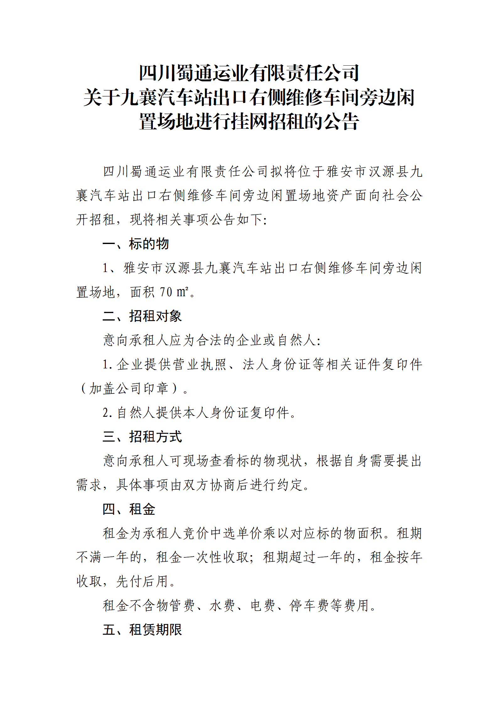 四川蜀通運業(yè)有限責任公司 關于九襄汽車站出口右側維修車間旁邊閑置場地進行掛網招租的公告