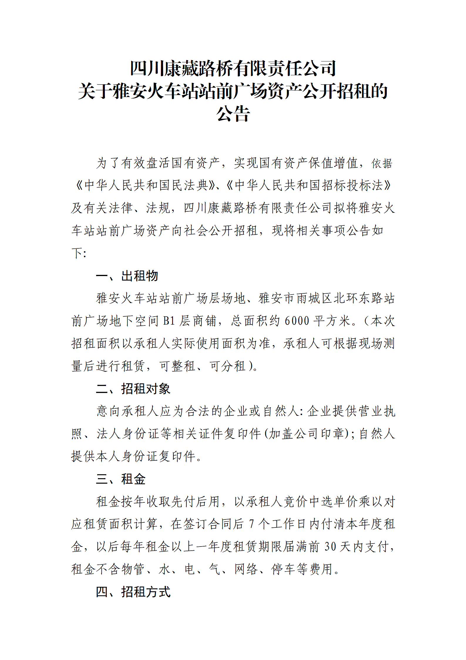 四川康藏路橋有限責任公司站前廣場資產招租公告