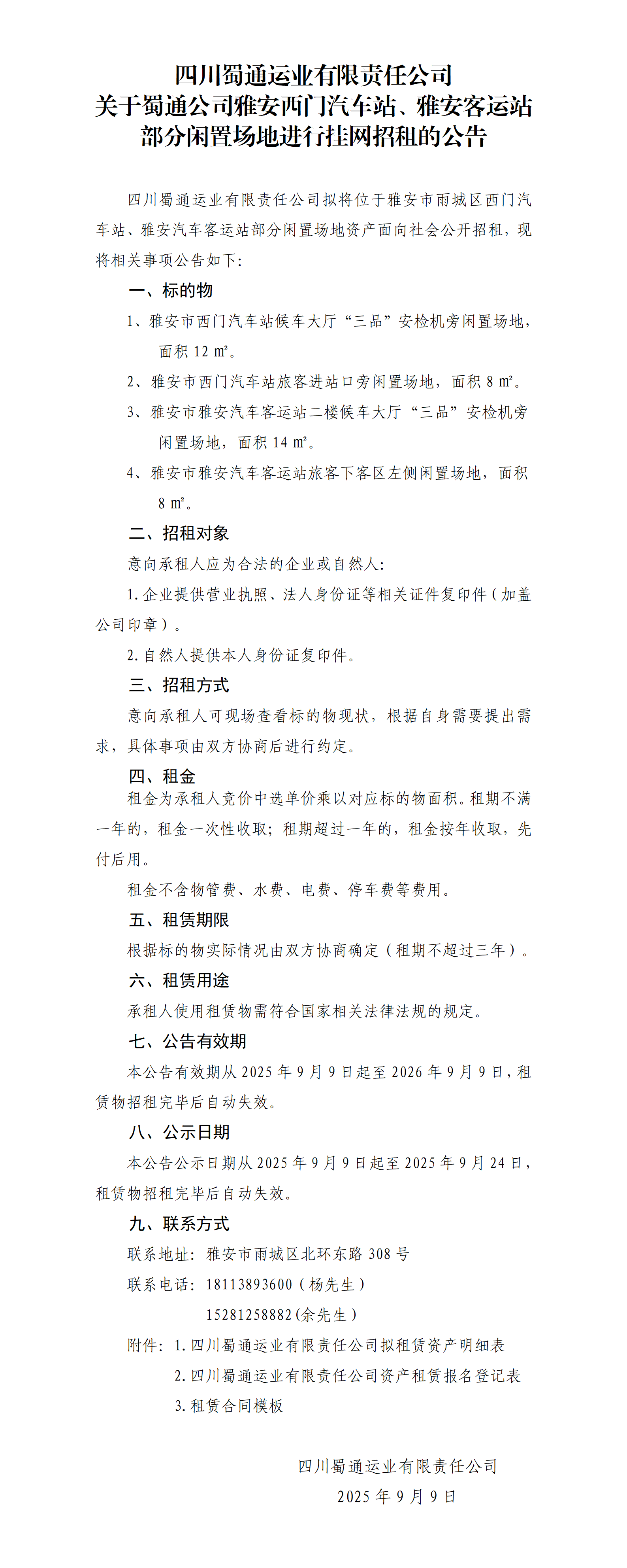 四川蜀通運業(yè)有限責(zé)任公司 關(guān)于蜀通公司雅安西門汽車站、雅安客運站部分閑置場地進(jìn)行掛網(wǎng)招租的公告
