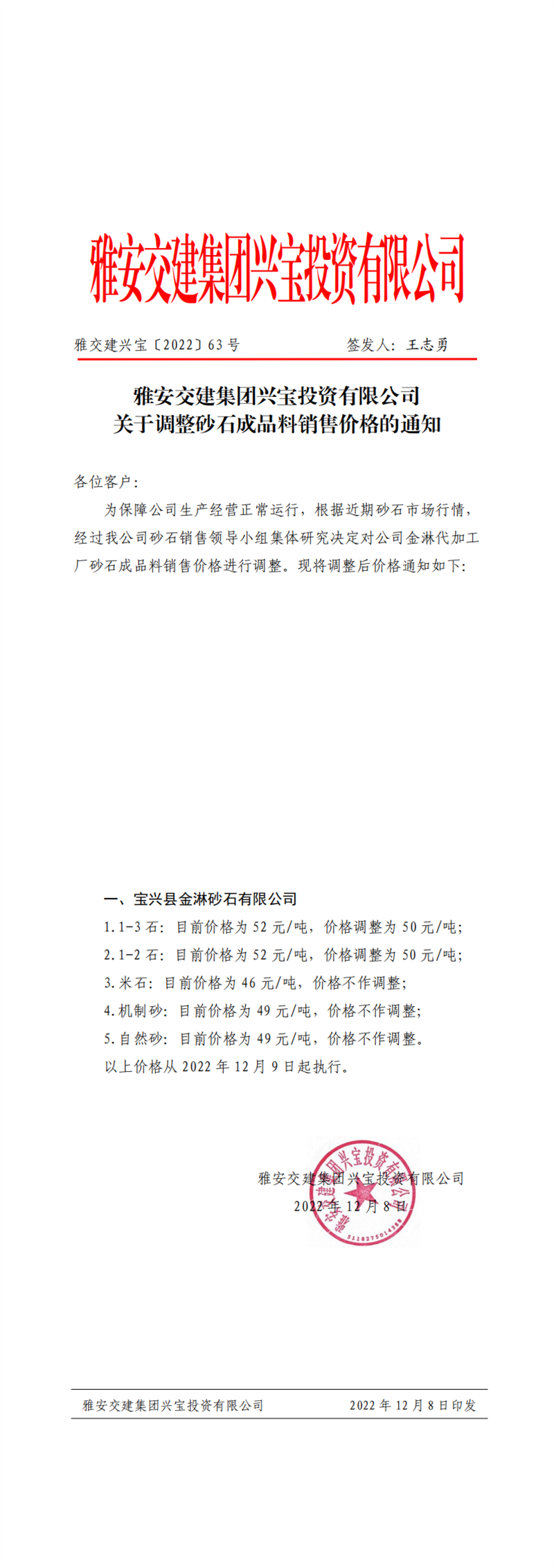 雅交建興寶〔2022〕63號(hào) 關(guān)于調(diào)整砂石成品料銷(xiāo)售價(jià)格的通知(2022-12-8)