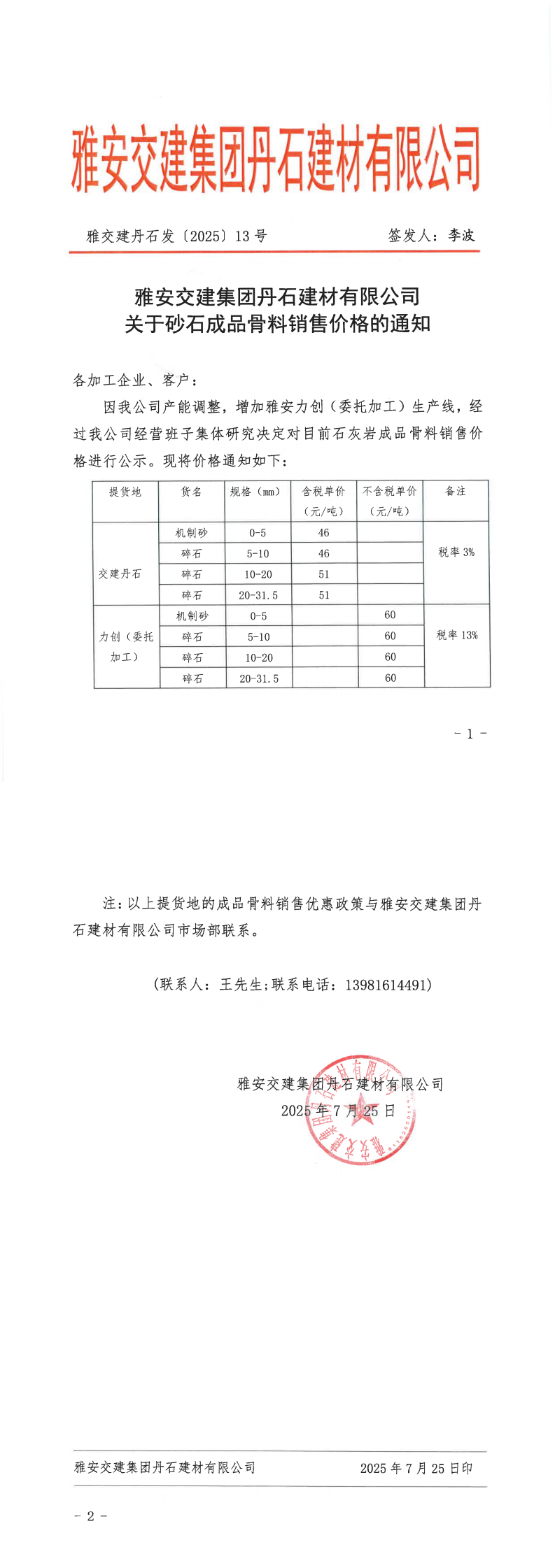 雅安交建集團丹石建材有限公司關(guān)于調(diào)整砂石成品骨料價格的通知(2025.7.28)